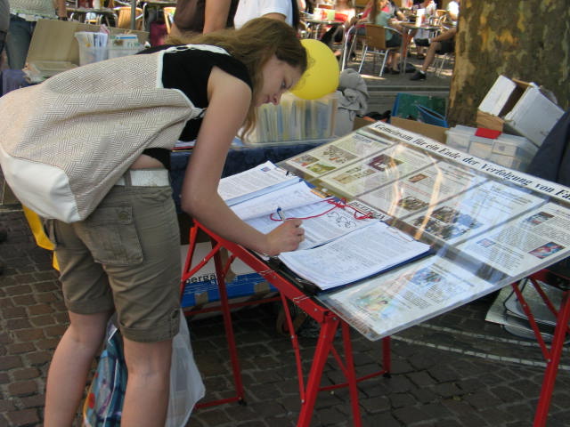 法轮功学员在德国Offenburg市中心讲真相图为民众了解真相后,签名制止迫害2008-7-26