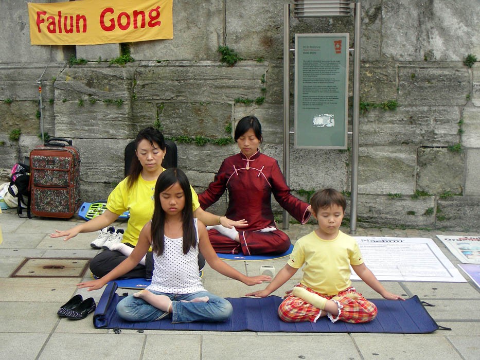 世界杯足球赛期间 德国学员来到比赛城市纽伦堡将中共活体摘取法轮功学员器官的残暴罪行曝光于世 图为功法演示2006-6
