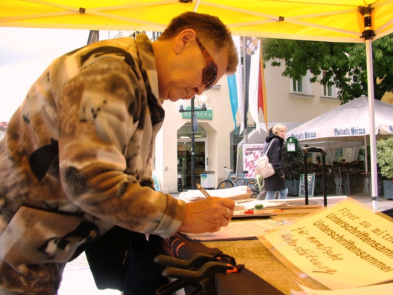 法轮功学员在慕尼黑市中心广场设立真相点,了解真相的人们签名制止迫害