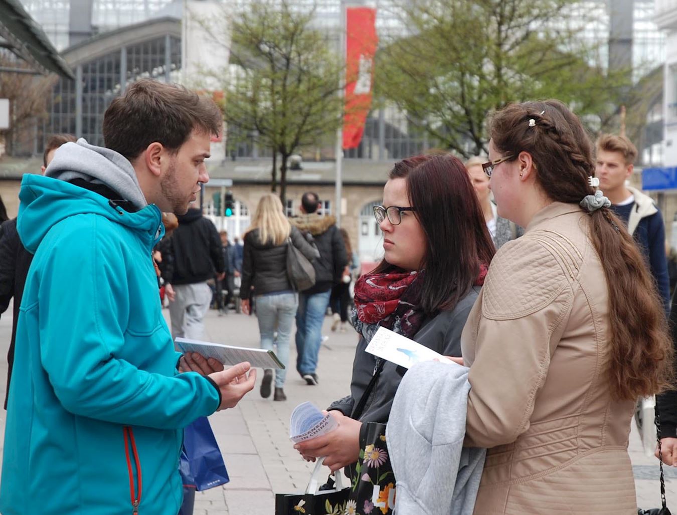 德国法轮功学员"中国时代"活动期间在汉堡火车站前向民众讲真相