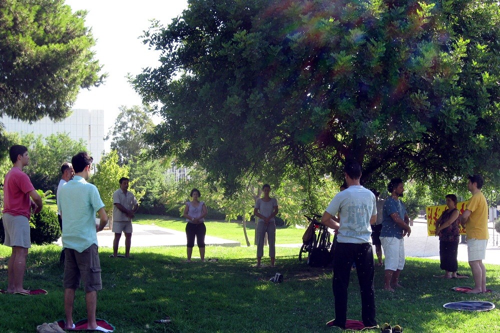 法轮功学员在雅典市中心中央广场附近的公园炼功