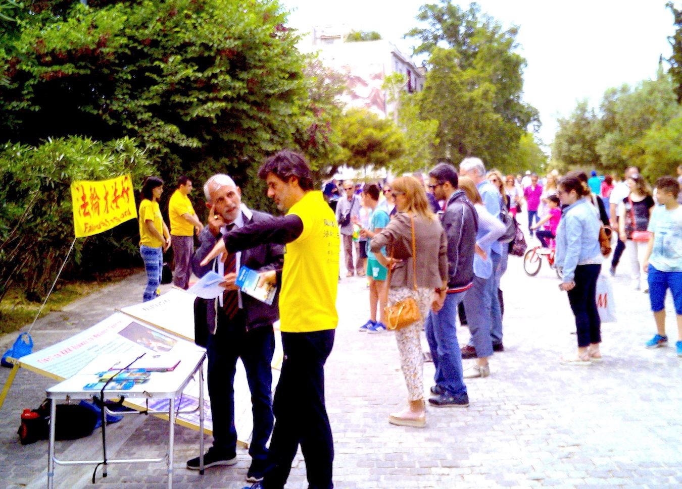 法轮功学员在雅典市中心中央广场举办讲真相活动