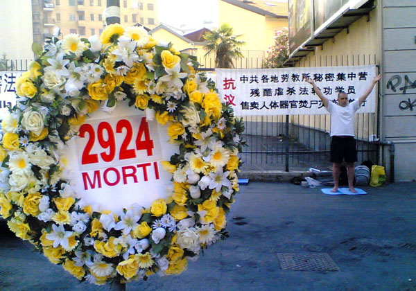 法轮功学员七二零在米兰中领馆前和平抗议迫害八年并悼念迫害致死的同修2007-7-20