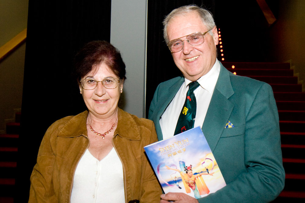 神韵巡回艺术团在意大利米兰安联剧院的演出,获观众好评,图为意大利老人意玛里力先生一家 2008-4-15至16