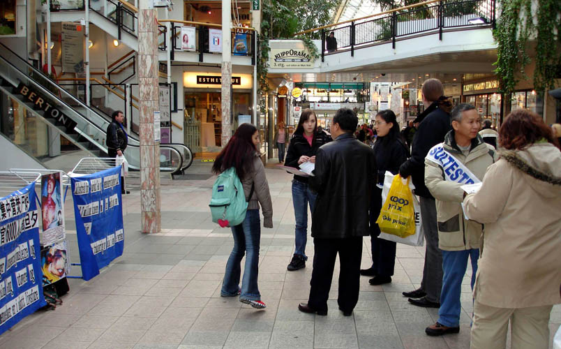 挪威学员博德市市中心绝食抗议中共苏家屯集中营暴行 图为民众在了解真相2006-3-13