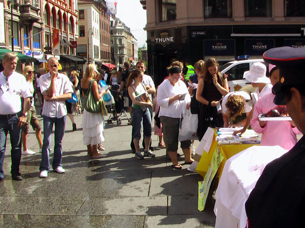 挪威法轮功学员在奥斯陆市中心揭露中共活摘器官暴行,图为民众排队签名反迫害2006-7-28