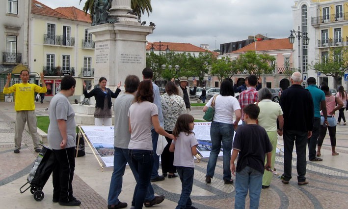 葡萄牙Coimbra的民众看真相展板和演示功法,签名支持反迫害