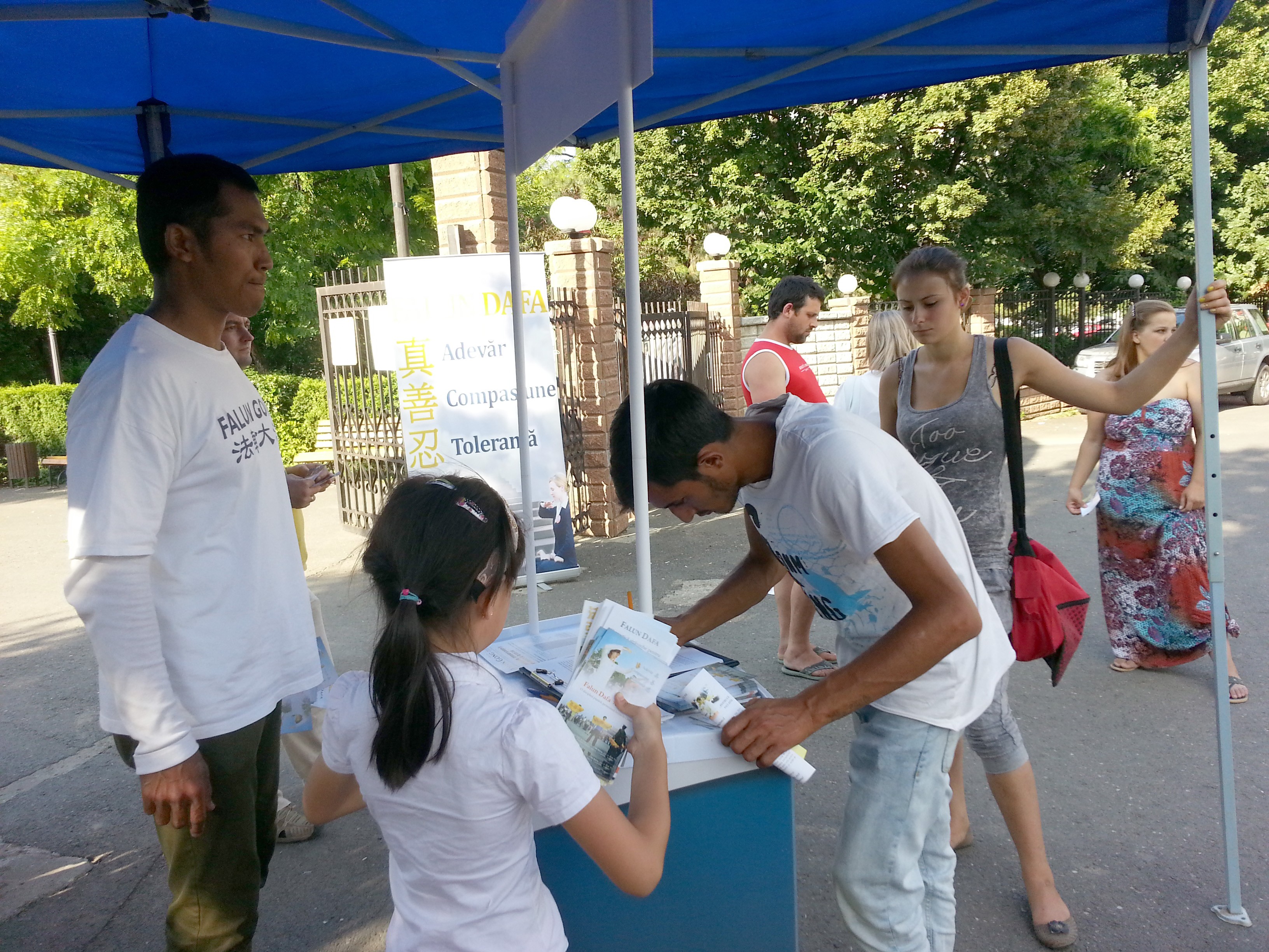 罗马尼亚法轮功学员在布加勒斯特市中心的Cismigiu公园的入口处举行了一场反迫害讲真相活动