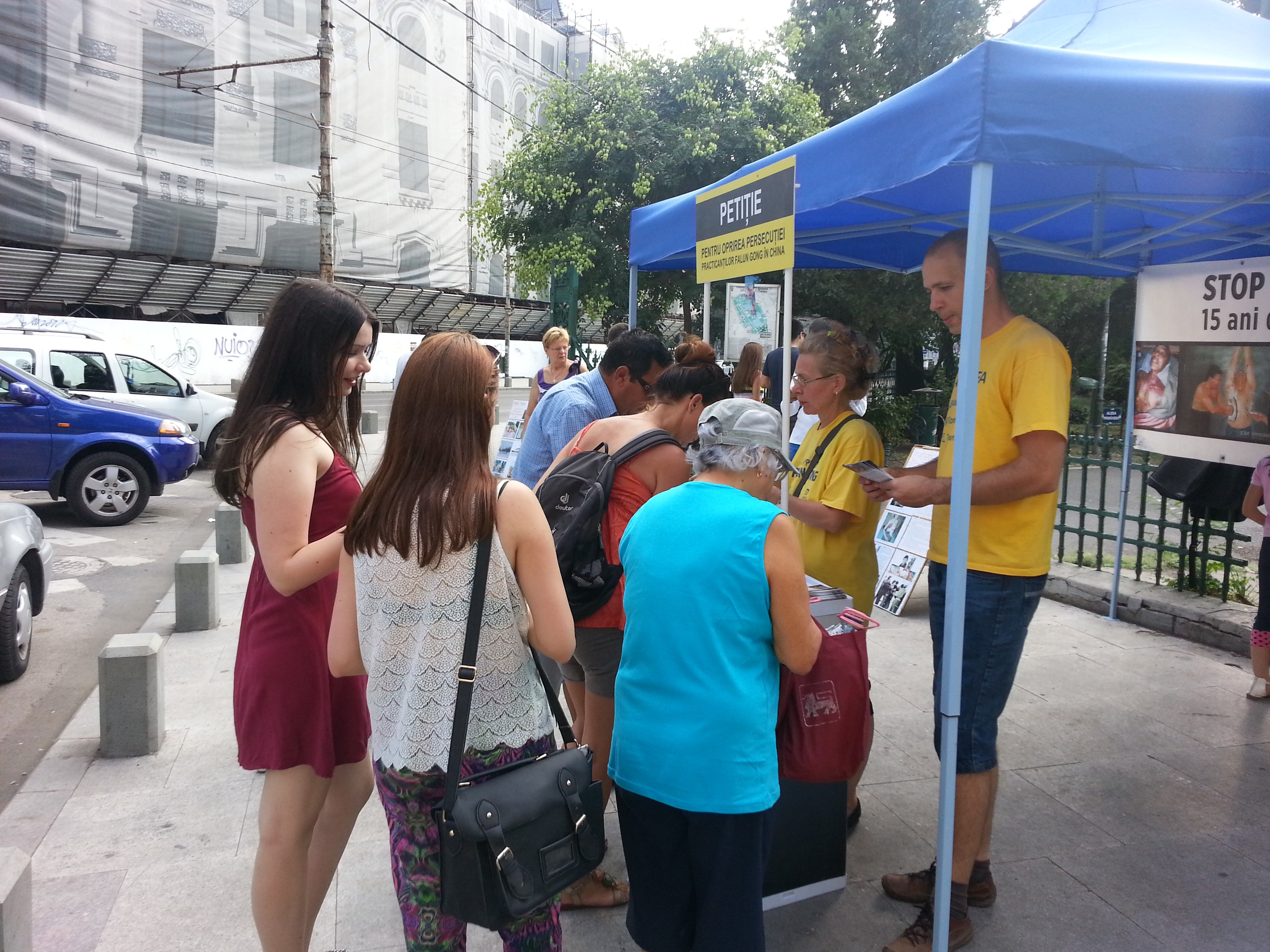 布加勒斯特市中心,罗马尼亚民众聆听法轮功真相,签名反迫害