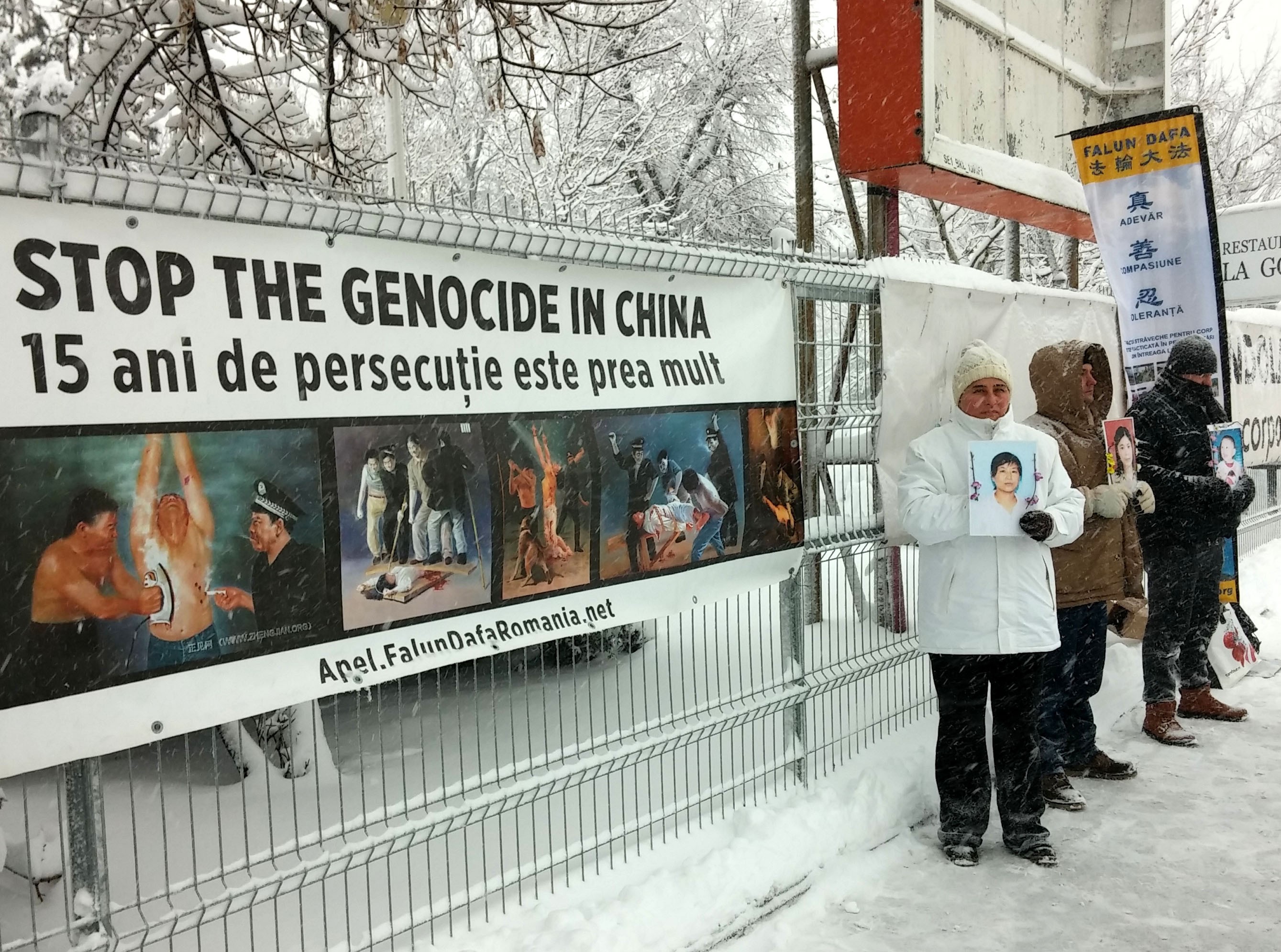 法轮功学员顶风冒雪在中共驻罗马尼亚大使馆前抗议中共的暴行