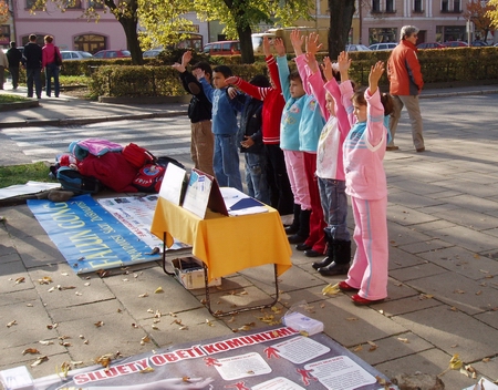 斯洛伐克法轮功学员来到西部的Hlohovec市向人们介绍发生在中国的对法轮功的残酷迫害 图为功法展示