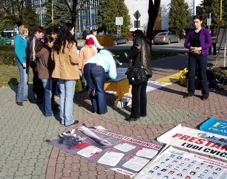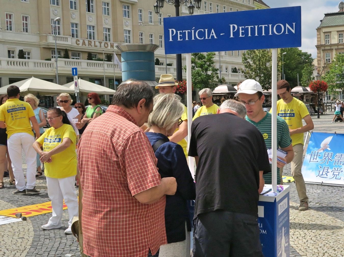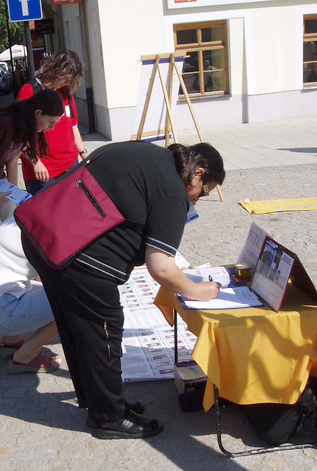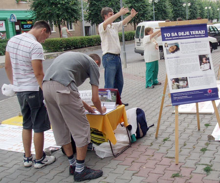 法轮功学员在斯洛伐克城市洪法及揭露中共的残酷迫害图为民众签名反迫害2007-8-10