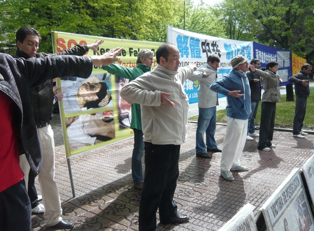 西班牙法轮功学员在中领馆前炼功、发正念
