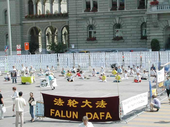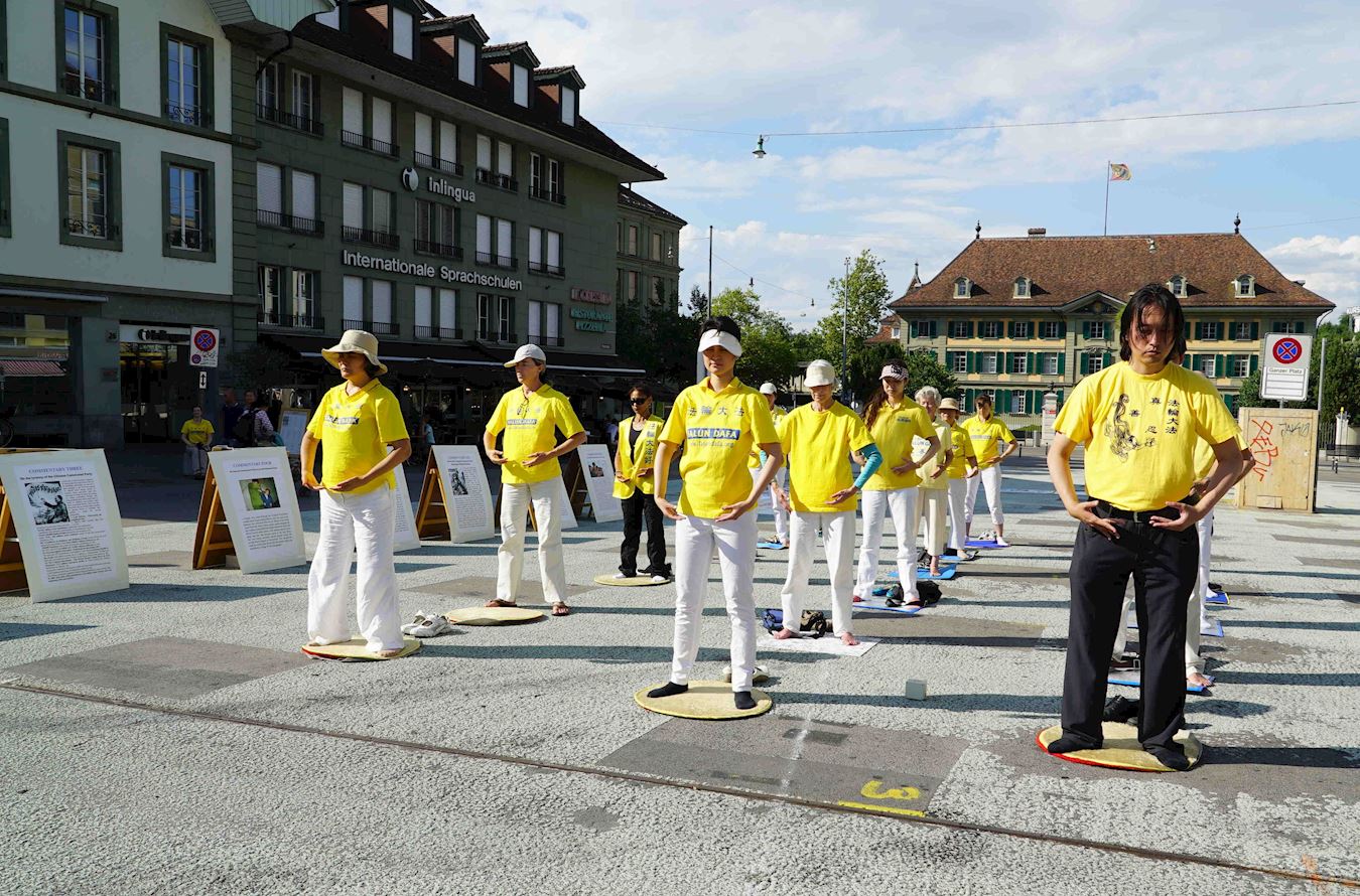 法轮功学员在瑞士的联邦广场并举行,让活动更多人关注正在被中共迫害,