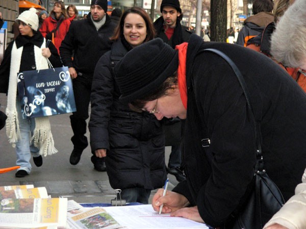 法轮功学员在日内瓦商业街传真相,民众踊跃签名支持反迫害
