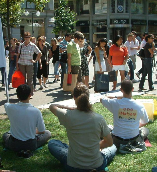 法轮功学员在瑞士苏黎世购物大街设立信息摊位洪法并揭中共的残暴罪行图为演示祥和功法2007-8-25