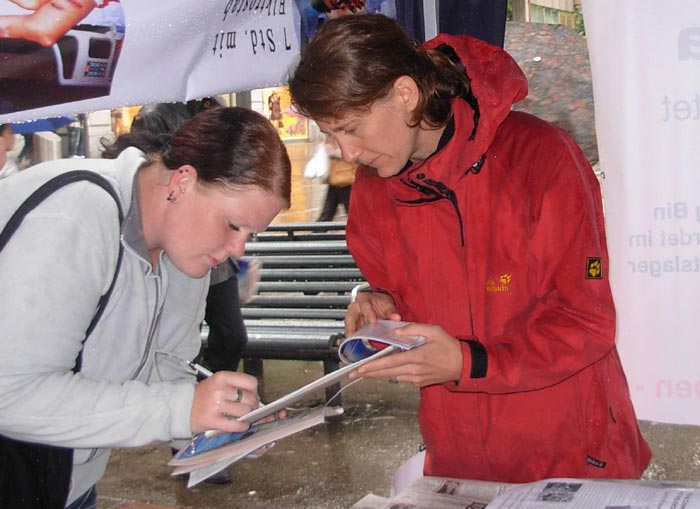 法轮功学员在瑞士苏黎世购物大街设立信息摊位揭中共的残暴罪行图为人们签名制止中共迫害2007-8-25