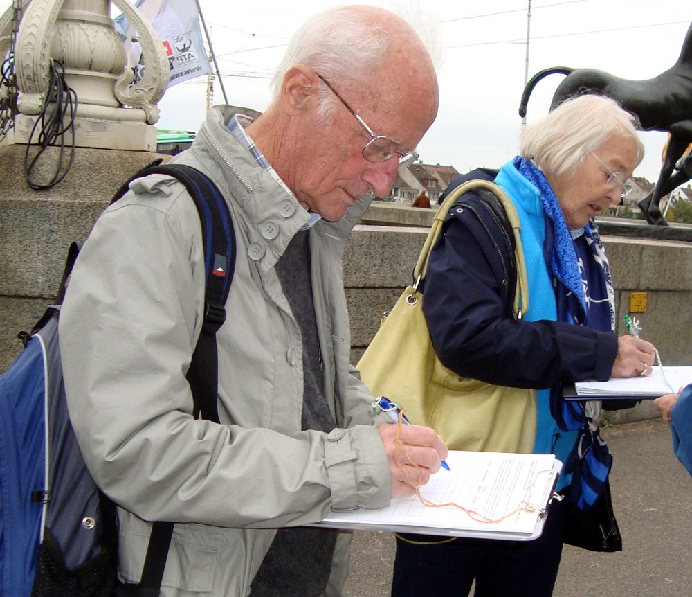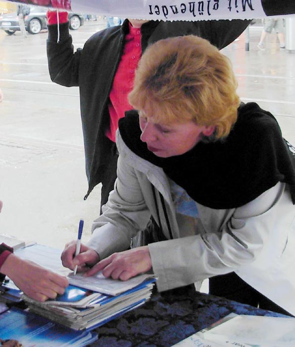 法轮功学员在瑞士首都伯尔尼举行游行并声援一千五百万人退党图为民众在签名表上签名反迫害2006-11-4