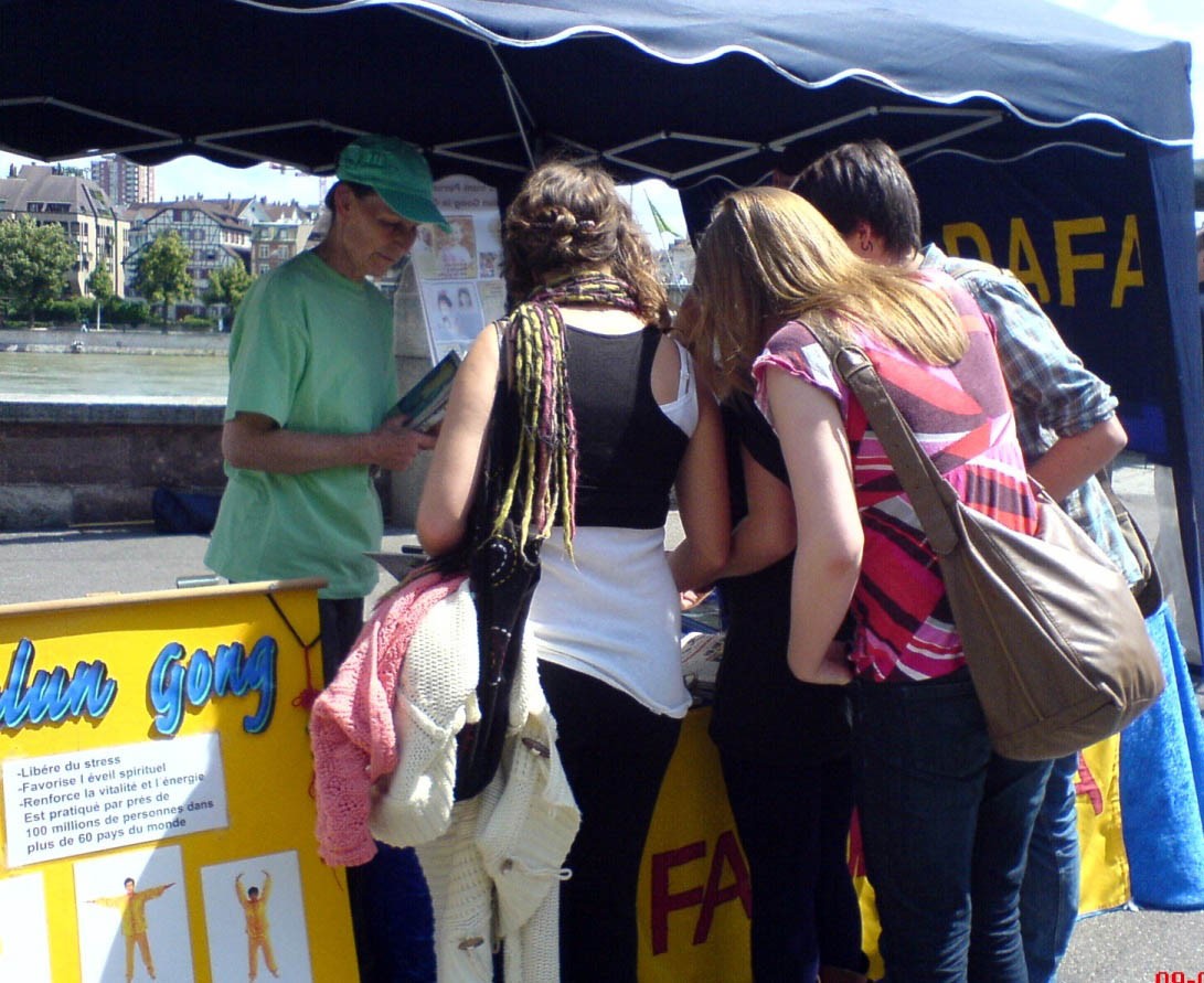 法轮功学员在瑞士伯尔尼的亚洲节上举办讲真相活动图为许多人接读法轮功真相材料2008-7-26