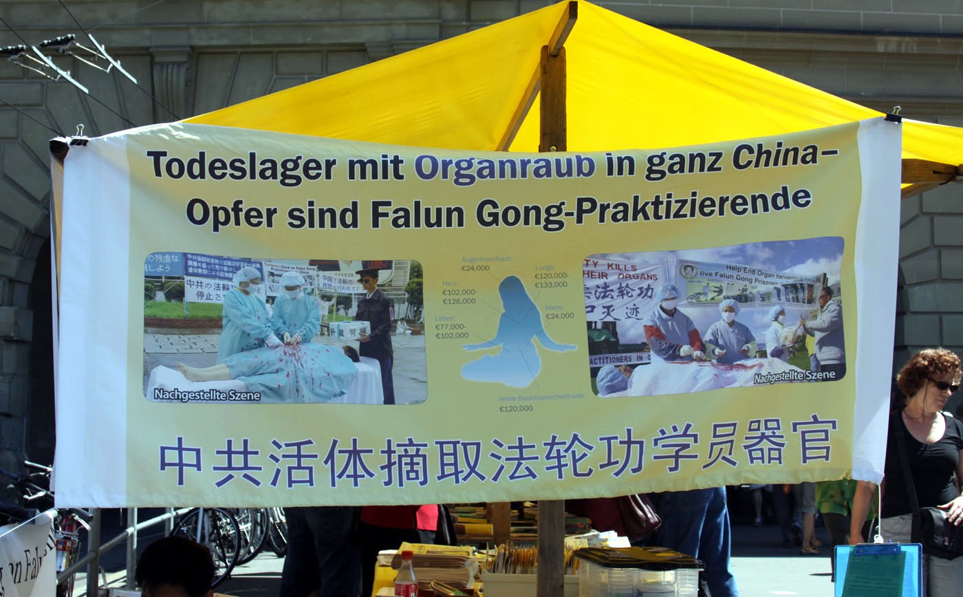 法轮功学员在Kornhaus广场设立真相点,制止中共活摘器官及声援诉江大潮征签