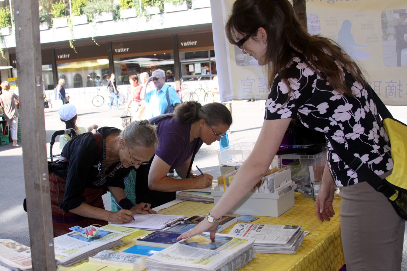 法轮功学员在Thunplatz广场,呼吁制止十八年的迫害民众签名支持法轮功