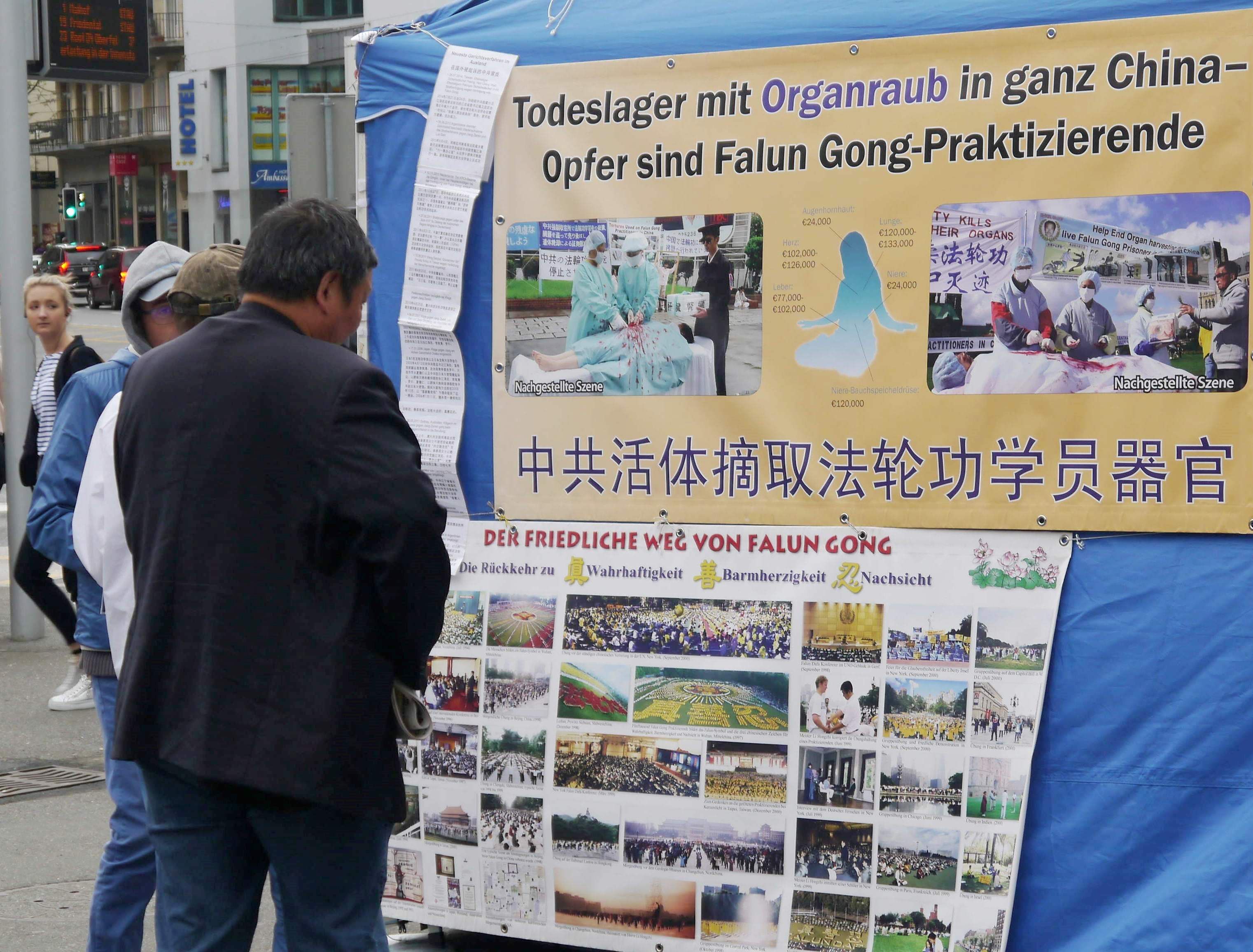 瑞士法轮功学员在苏黎世的Paradepaltz广场讲真相图为民众驻足观看残酷迫害的展板