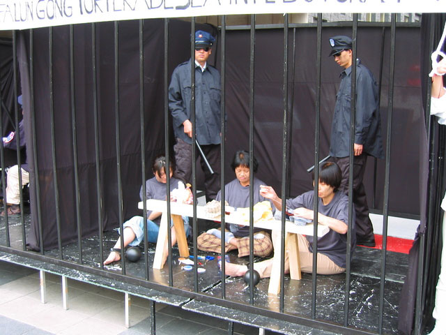 瑞典学员在斯德哥尔摩举办反酷刑展 图为学员在做功法展示