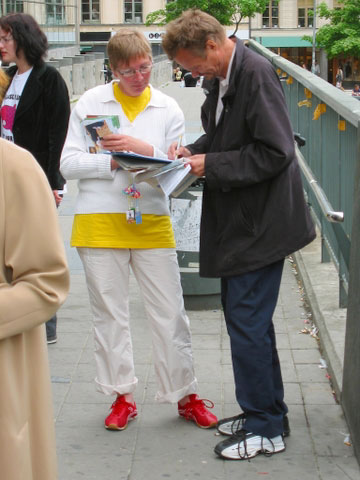 瑞典法轮功学员声援香港反对23条立法 过往群众观看展板 2003-7-1