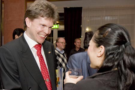 神韵艺术团在瑞典演出图为Lindblad国会议员赞赏神韵精湛的演出,不同于集权的思维方式2008-3-25