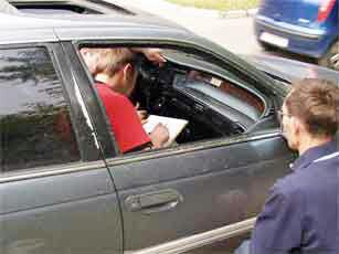 乌克兰法轮功学员来到德鲁斯科夫市洪法讲真相 图为公交车上的乘客和司机透过车窗看学员炼功 2007-4-29