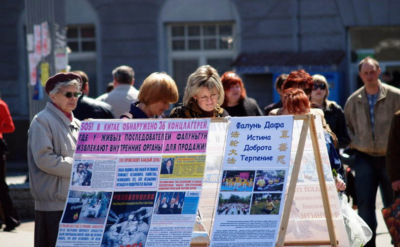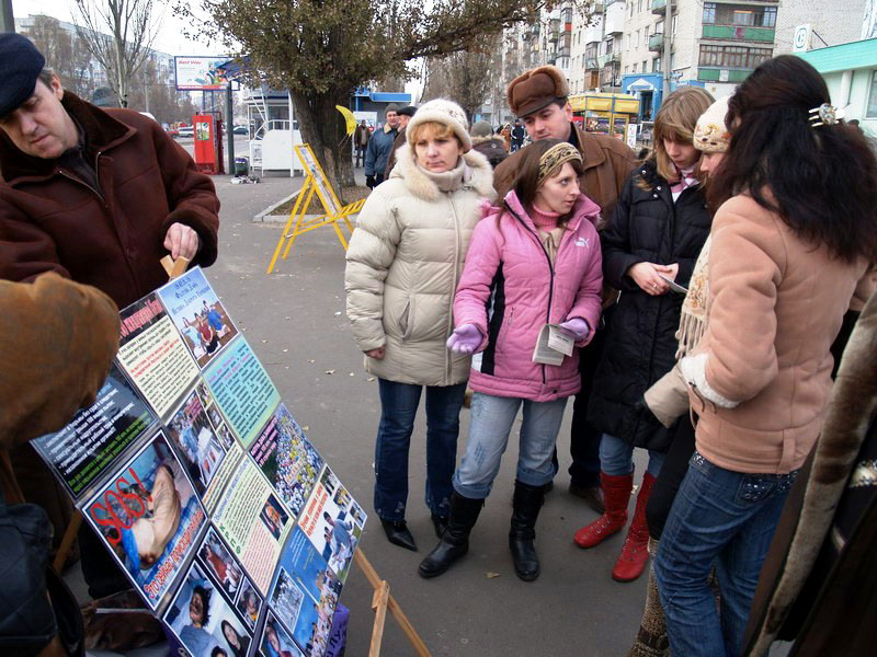 法轮功学员在乌克兰Lugansk市中心举行活动图为学员向人们揭露中共活摘器官的暴行2007-8-4