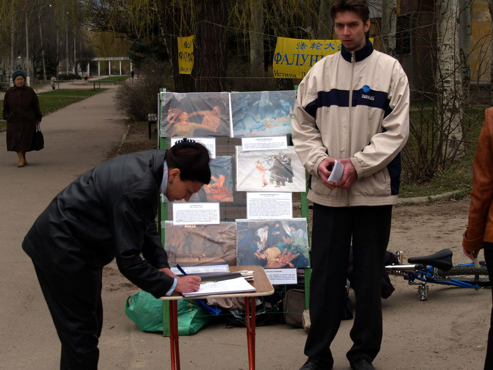 乌克兰学员在北-多涅茨克揭露中共活摘法轮功学员器官的暴行 图为人们纷纷签名谴责迫害2007-2-3