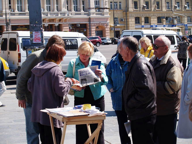 乌克兰法轮功学员在"康斯坦基诺夫"(Константиновка)市举行洪法巡回画展 图为学员在大街上派发展览会的邀请