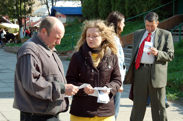乌克兰法轮功学员来到德鲁斯科夫市洪法讲真相 图为市民在了解真相 2007-4-29