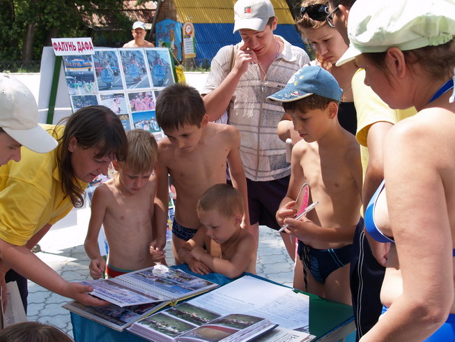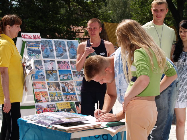 乌克兰法轮功学员在克拉玛托斯克市中心公园洪法讲真相 图为游人签名支持法轮功反迫害2006-7-20