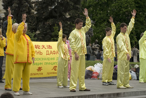乌克兰各地学员举行活动庆祝世界法轮大法日和大法洪传世界十六周年,图为乌克兰首都学员演示功法 2008-5