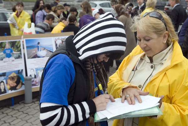 乌克兰法轮功学员斯拉夫市举办"慈悲之路"画展 图为签名呼吁停止迫害