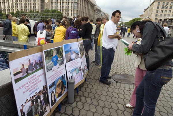 乌克兰各地学员举行活动庆祝世界法轮大法日和大法洪传世界十六周年,图为人们纷纷签名反对中共迫害法轮功 2008-5