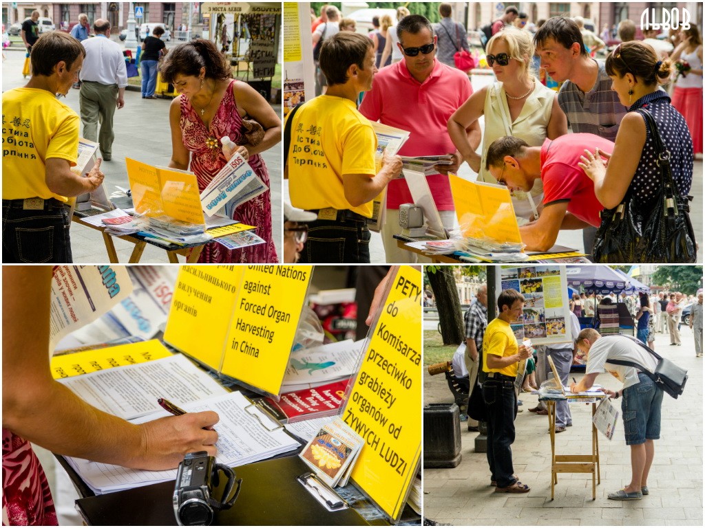 法轮功学员在乌克兰不同区域讲真相大法福音传遍大小城市图为民众签字谴责中共暴行