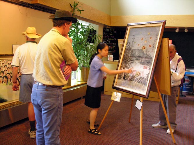 加拿大"真善忍"巡回画展在卡尔加里(Calgary)艾波克(Epcor Center)表演艺术中心举行 图为法轮功学员在解答观众的提问