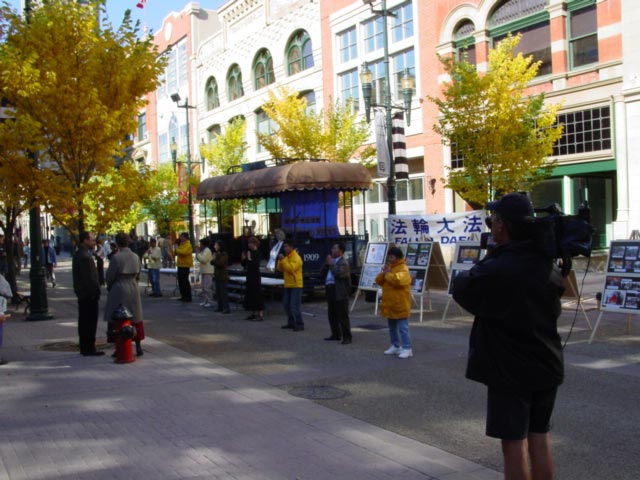 加拿大卡尔加里法轮功学员在市中心奥林匹克广场庆祝世界法轮大法日 向路人讲真相