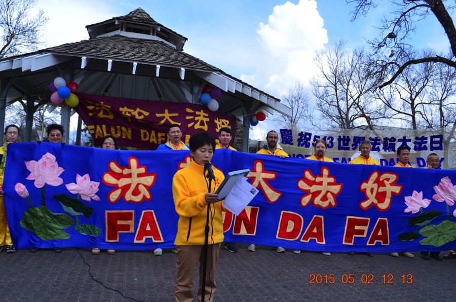 世界法轮大法日埃德蒙顿法轮功学员举行庆祝活动,图为学员宣读市政府褒奖