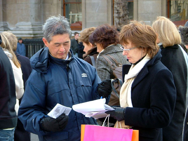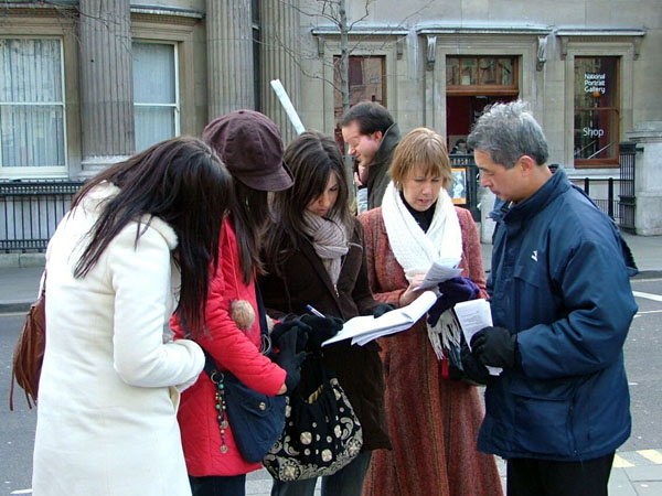 法轮功学员在伦敦游行,集会,吁各界共同制止中共迫害。图为向民众介绍真相 2006-7-15