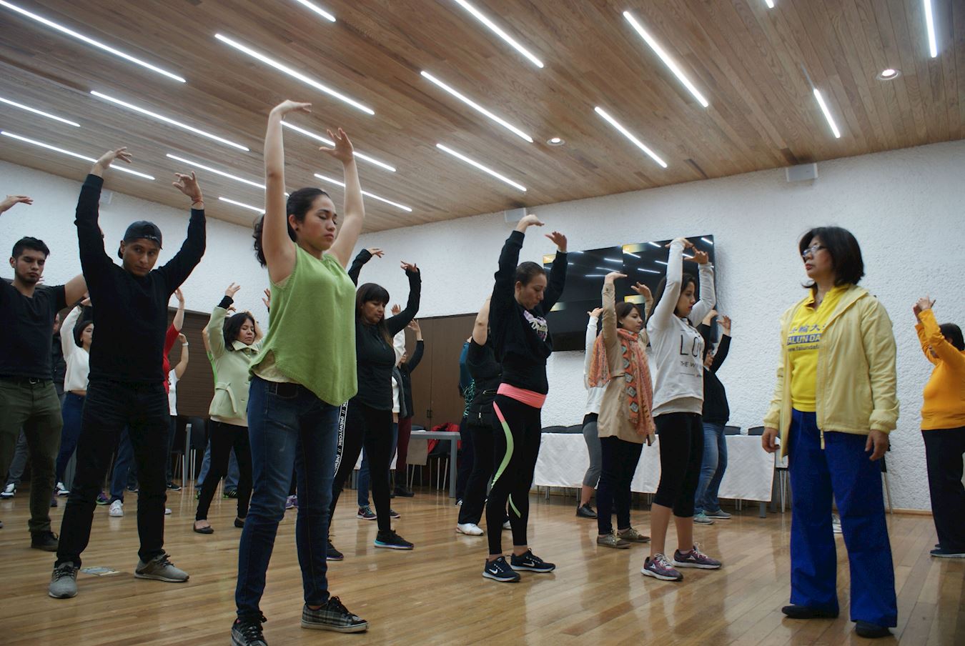 "墨西哥法轮大法修炼心得交流会"在墨西哥城举行并举行活动图为民众学炼功法