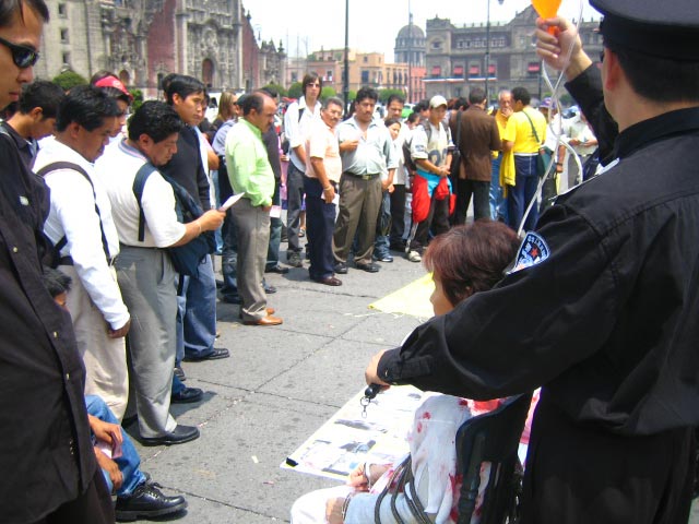 2002年10-11月墨西哥洪法图片--2002年10月10日,当地学员向司机发洪法传单