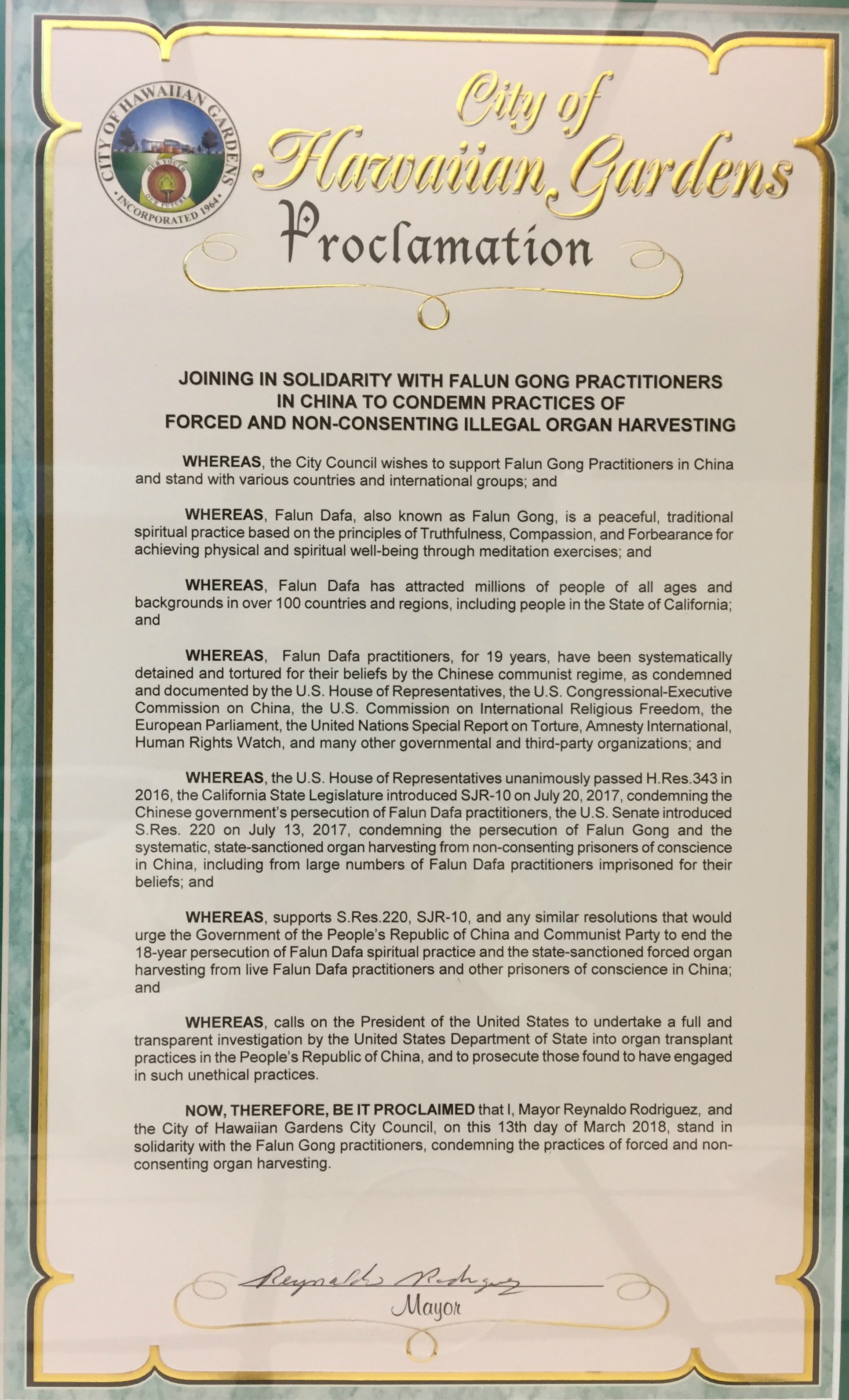 法轮功,洛杉矶夏威夷花园市通过反强摘器官宣言 【明慧网】