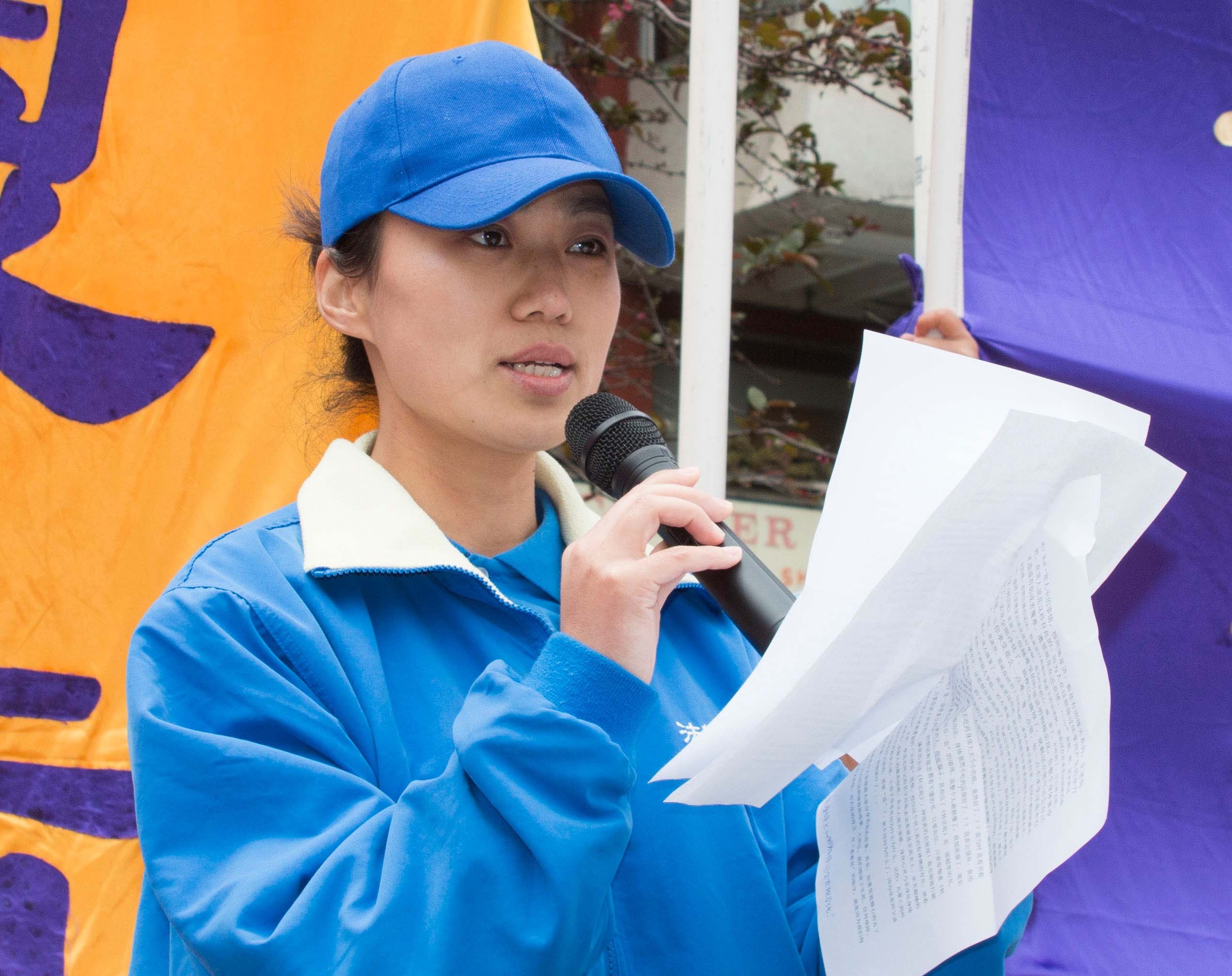 中国死尸在旧金山展出,多个组织在旧金山美生堂前召开新闻发布会,呼吁关注中国人权,图为法轮功学员代表张雪容