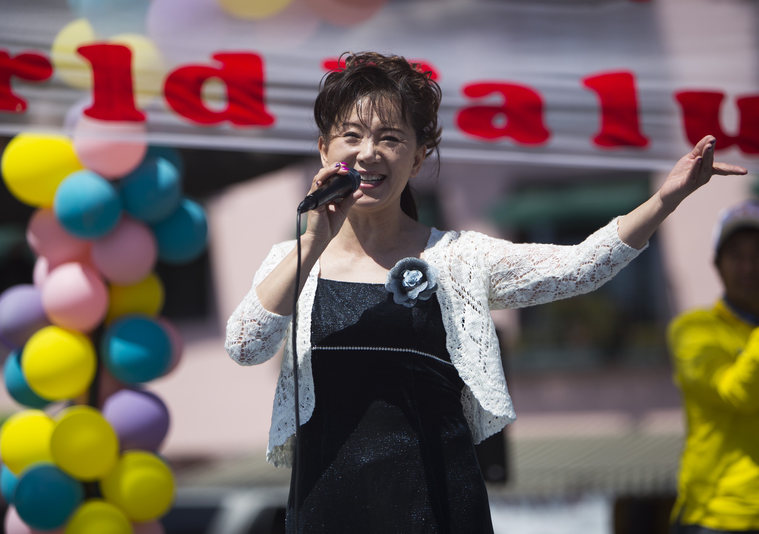 法轮功学员应邀出席加州湾区华运会展现大法美好图为三岁小弟子表演伞中舞2007-7-22