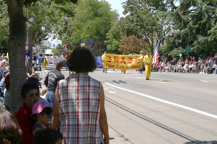 法轮功学员参加北加州木城国庆游行 图为法轮功旗阵和炼功队受到观众的欢迎2007-7-4