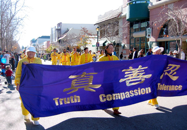 北加州学员应邀参加圣荷西市新年游行再获好评 图为法轮大法好横幅